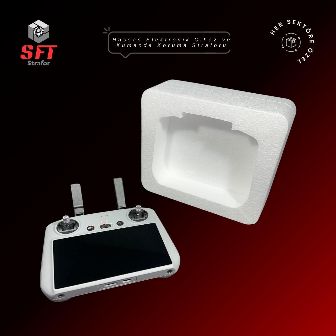 Elektronik cihaz paketlemesinde en büyük risk, cihazın üzerindeki çıkıntılı parçaların (joystickler, tuşlar, antenler) veya kırılgan ekranların kutu çeperine baskı yapmasıdır. Görsellerdeki drone kumandası örneğinde olduğu gibi, SFT Strafor'un ileri teknoloji CNC kesim parkuru, cihazın 3D haritasını çıkararak her bir tuş, anten ve ekran için özel boşluklar (yuvalar) yaratır. Bu sayede cihaz straforun içine "glove-fit" (eldiven gibi) oturur ve basınç, kırılgan parçalara değil, doğrudan straforun darbe emici gövdesine dağıtılır.